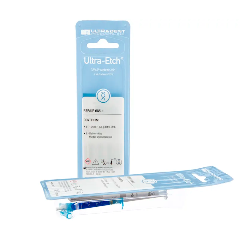 El grabador Ultra-Etch está indicado para su uso en dentina y esmalte para crear superficies de adhesión óptimas. El grabador Ultra-Etch se puede utilizar durante 5 segundos para eliminar las sales creadas al grabar la porcelana.