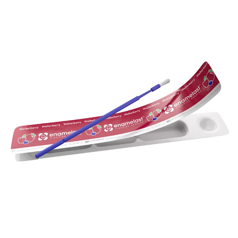 El barniz de flúor Enamelast es un fluoruro de sodio al 5% endulzado con xilitol en un soporte de resina. Su fórmula única está hecha con un agente promotor de la adhesión patentado para mejorar la retención, al mismo tiempo que proporciona una liberación y absorción superiores de flúor. Disponible en aplicaciones de jeringa con sabor a Walterberry™ y aplicaciones de dosis unitarias en Walterberry, Orange Cream, Cool Mint, Bubble Gum, Caramel y Flavor-Free. El barniz de flúor Enamelast produce una oclusión mecánica de los túbulos dentinarios en el tratamiento de la hipersensibilidad dental. La AAPD recomienda el uso del barniz de flúor como complemento preventivo para reducir el riesgo de caries.1 La ADA también ha respaldado el uso del barniz de flúor para la prevención de la caries.2